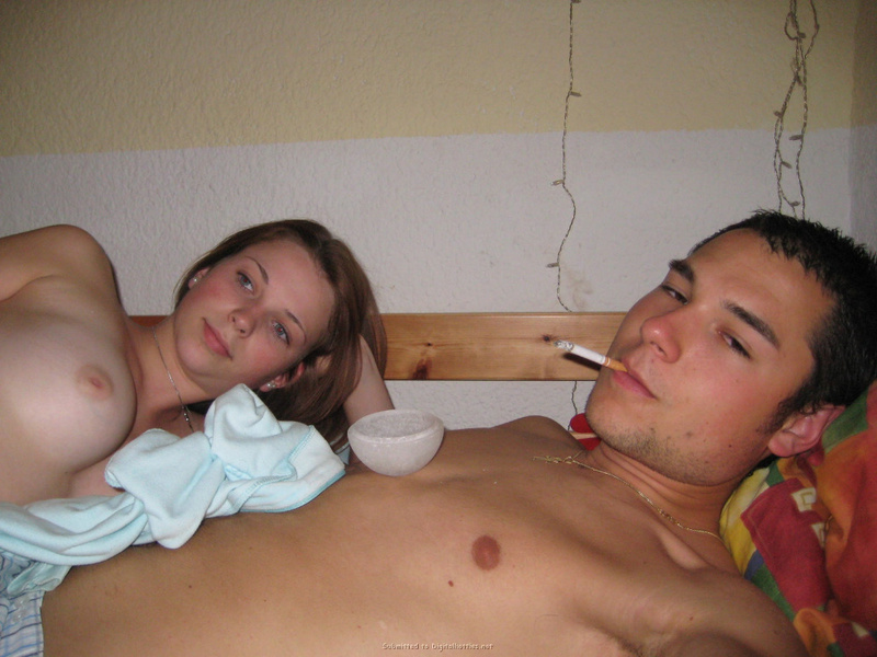 Молодая девка с голыми сиськами лежит в кровати с парнем