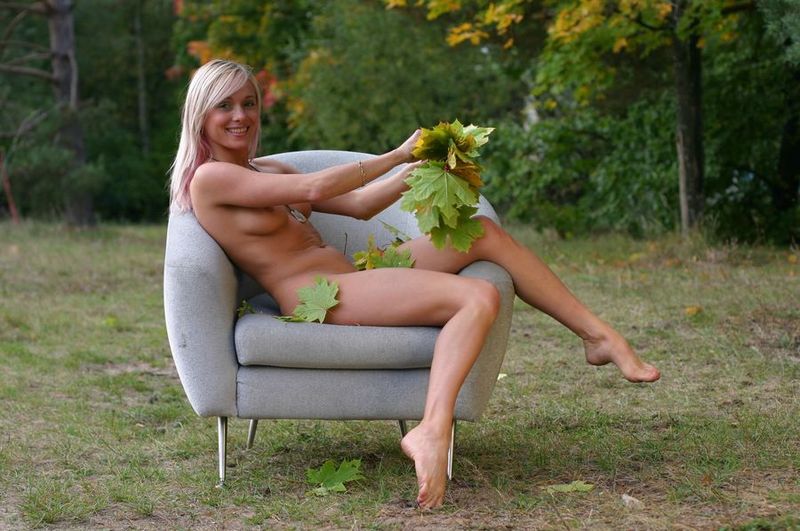 Порно фото похожее на Белокурая гимнастка позирует в осеннем лесу голышом: