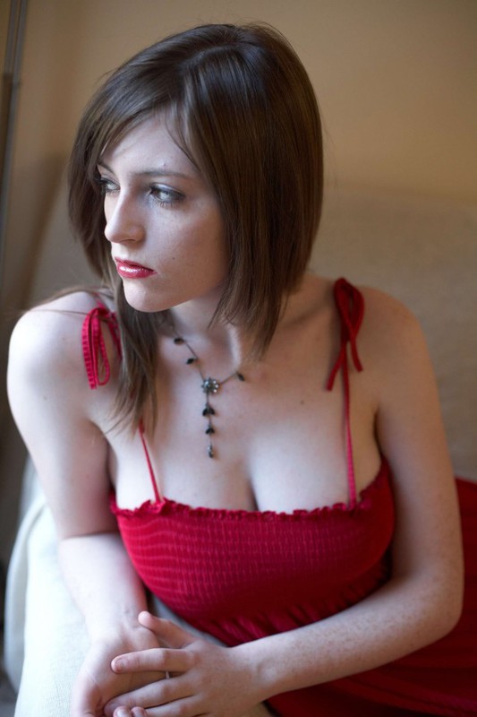 Грудастая телка с веснушками сняла красное платье и позирует на диване