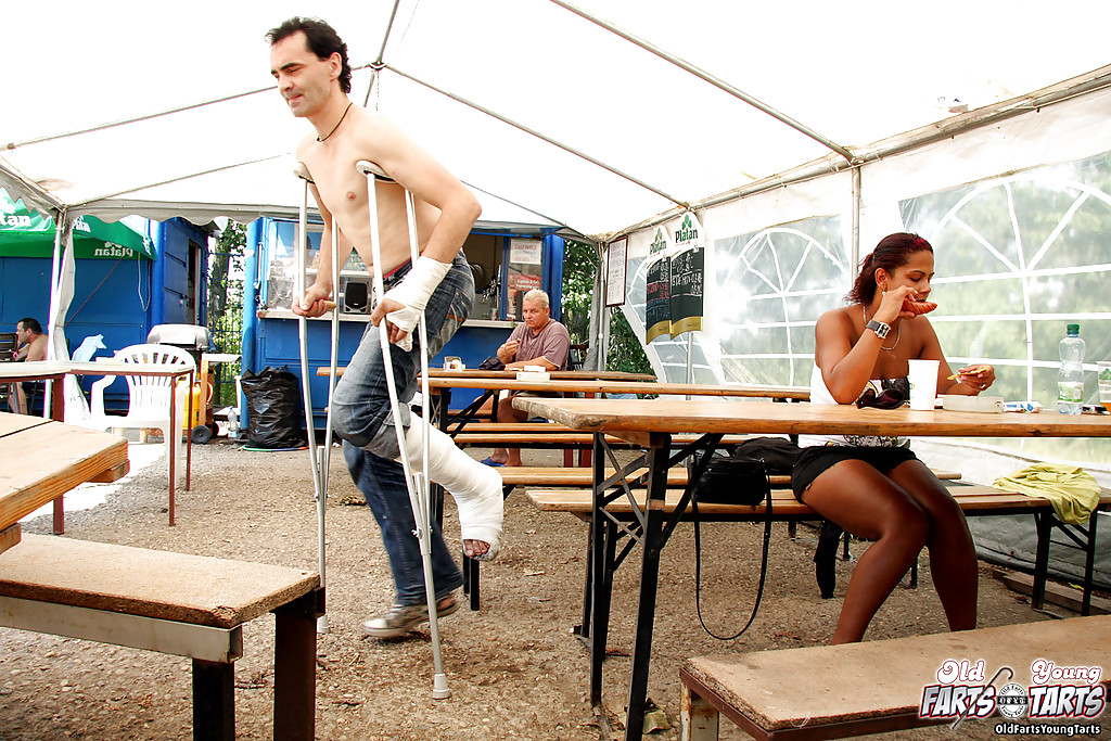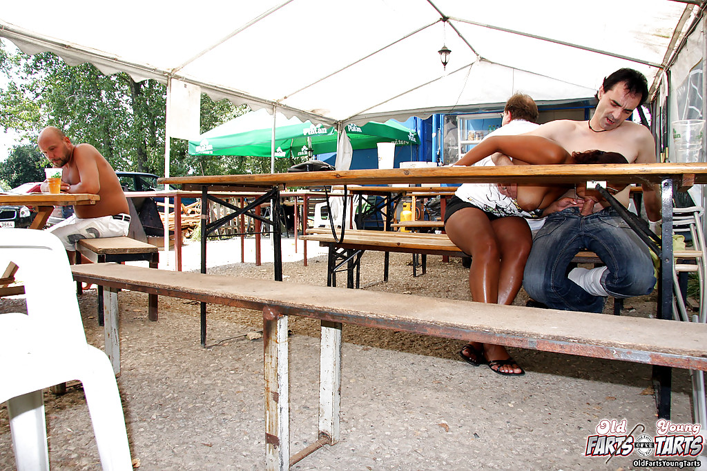 Порно фото похожее на Загорелая цыпочка сосет в кафе и трахается на улице: