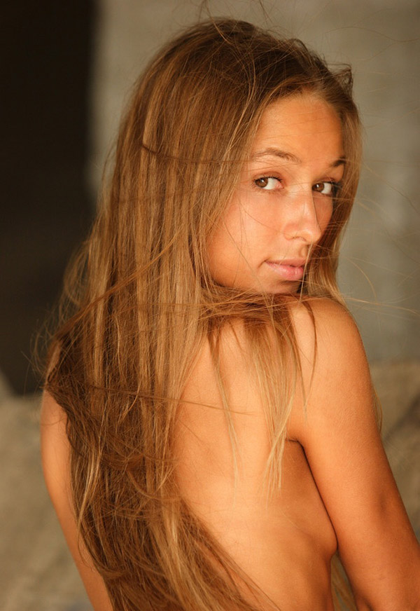 Русоволосая девушка с длинными ногами позирует голая в заброшенном здании