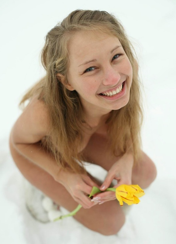 Молоденькая девица мерзнет на зимнем снегу голышом с желтыми тюльпанами