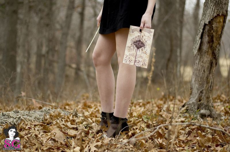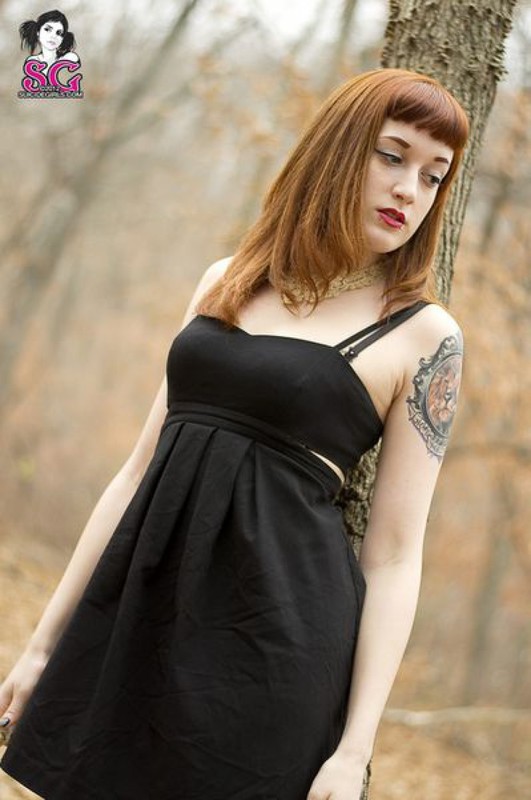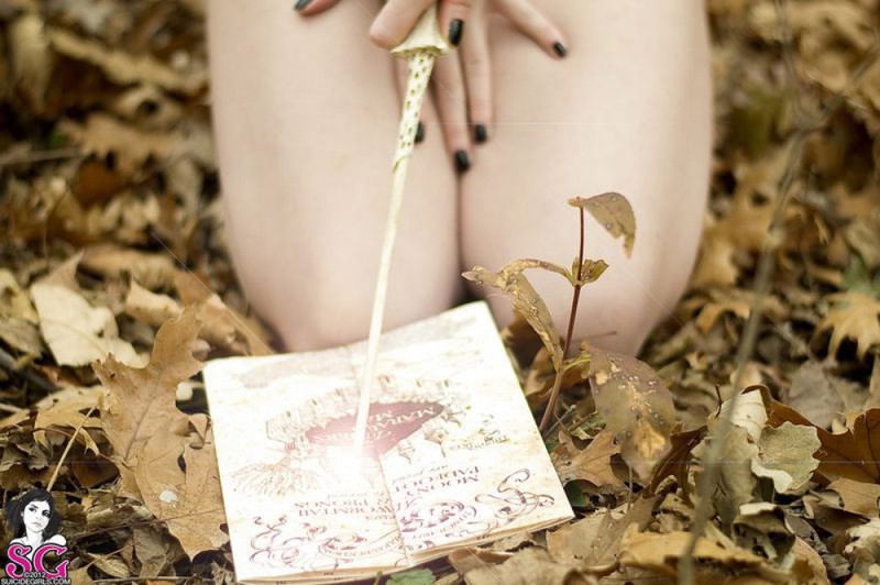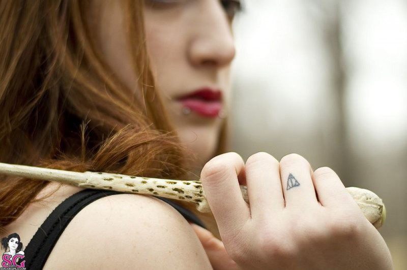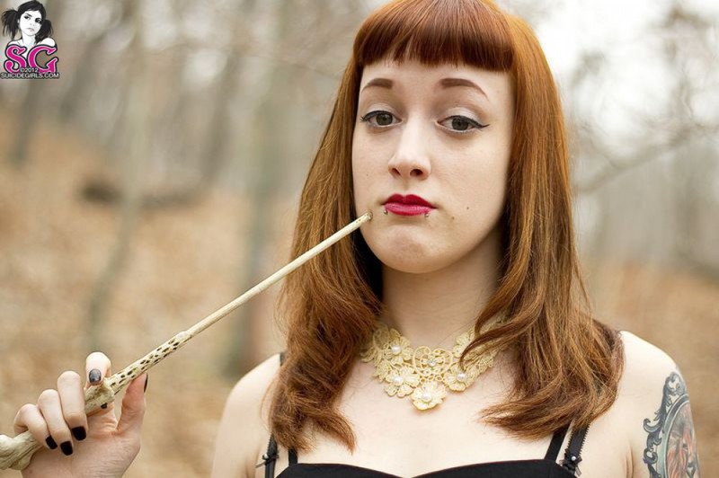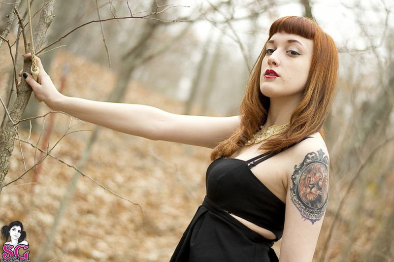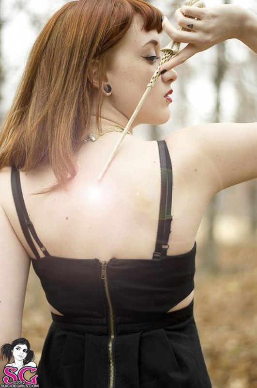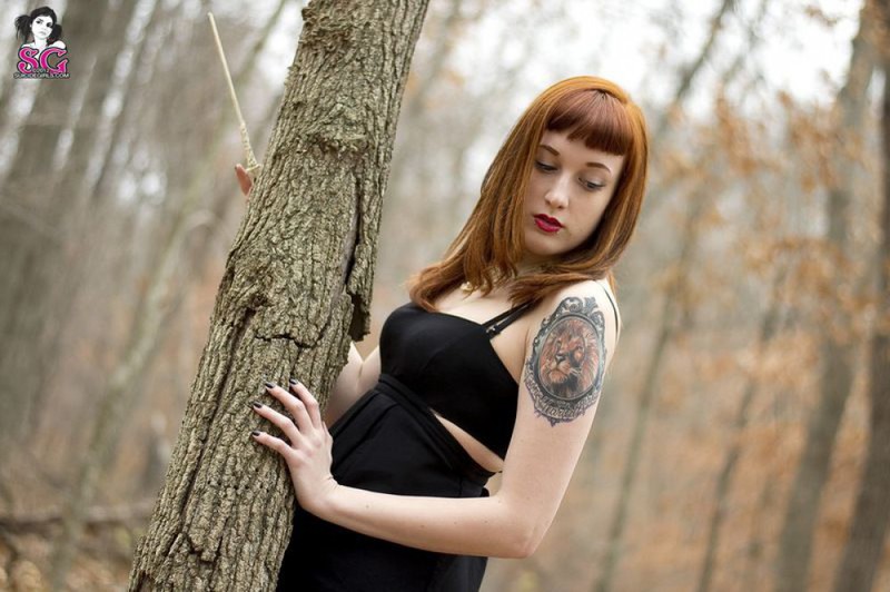 Порно фото похожее на Рыжая баба с татуировками в образе ведьмы сняла платье в лесу: