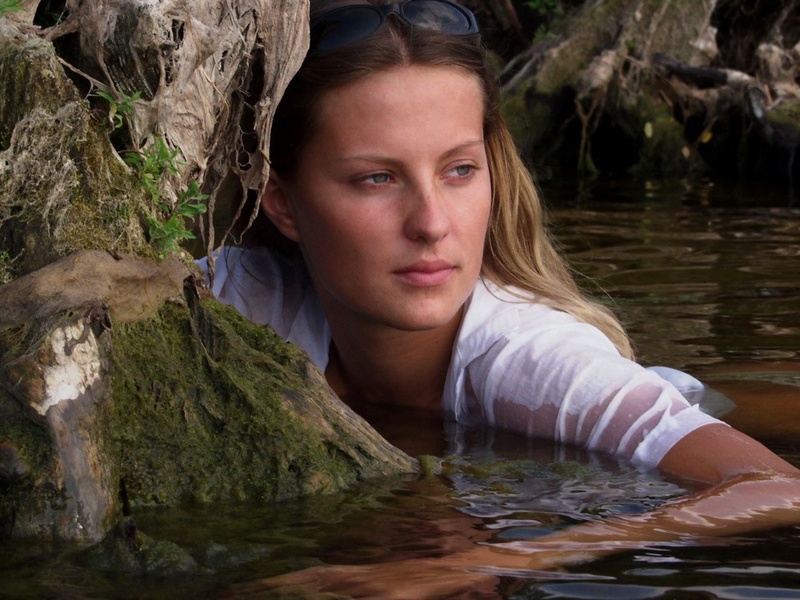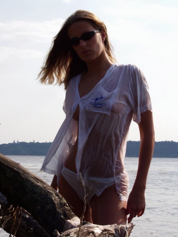 Порно фото похожее на Аппетитная куколка позирует на речке в белых трусиках: