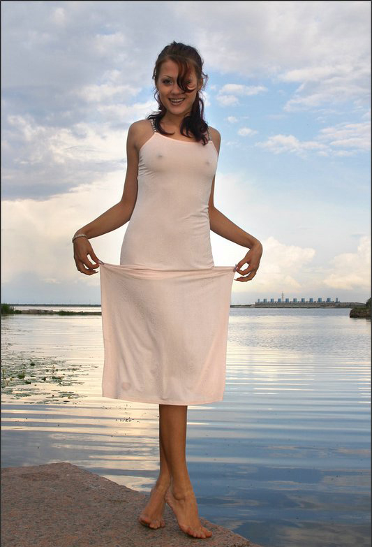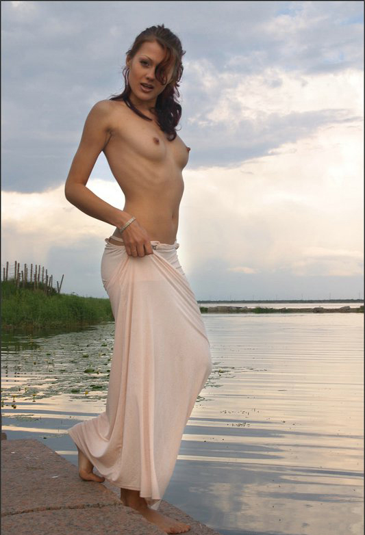 Порно фото похожее на Голая брюнетка нежно позирует на берегу реки: